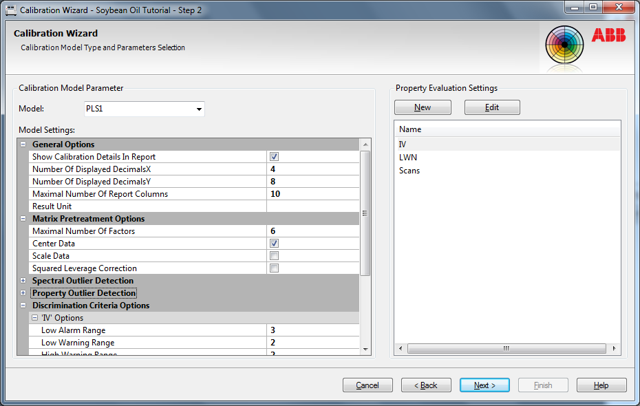 In case of a PCA calibration there are two different options to choose for the property evaluation settings and an additional Groups parameter will be available (see below):
