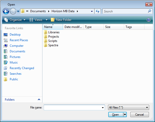 The File Open dialog lets the user specify the drive, directory, and the name of a file to open. The following illustration shows a typical explorer-style File Open dialog box. The dialog may appear different on your computer, the actual appearance depends on the operating system you are using.