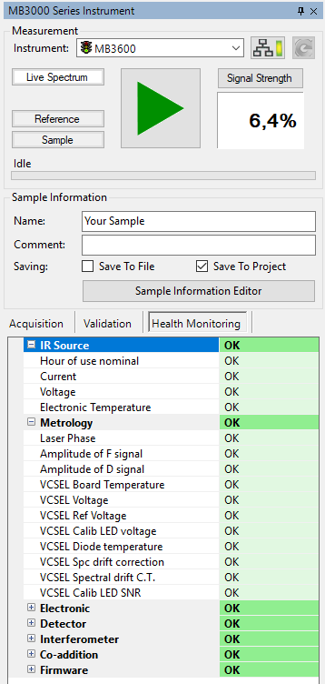 The instrument health monitoring parameters are categorized and will be updated as long as the instrument is connected. The Health Monitoring Tab is part of the Instrument Tab and lists all available health monitoring parameters. These parameters show the current health condition of the instrument: