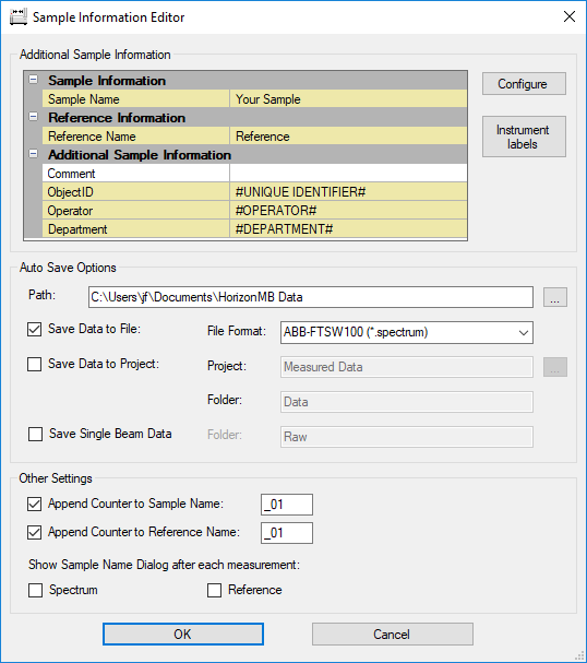 Adds a simple counter to the end of the sample name which will be incremented for each measurement. The sample name will always end with the counter number if this option is selected. The counter will be reset if the software is restarted or the counter is edited manually. -