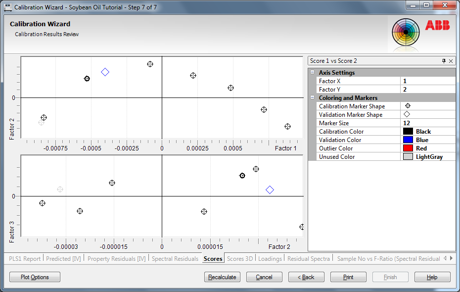In case of a PCA calibration the score plot gives a convenient overview of the qualitative results of the calibration. A good result will show all samples assigned to one of the predefined groups ( see Calibration Model Wizard - Step2 ) and the groups itself will be clearly separated.