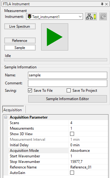 All kinds of measurements can be acquired by either selecting the Measure Spectrum command in the Instrument menu, or by clicking the **Measure-**button in the Instrument Tab. The measurement type and additional settings can be selected by adjusting the acquisition parameters in the instrument tab. The available measurement parameters differ slightly between the MB and FTLA/FTPA instrument series: