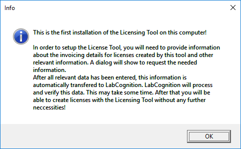 On very first start-up of the Licensing Tool you need to authenticate yourself and provide detailed contact information of yourself and your company. This information is first of all verified by labCognition before access to license creation is granted. Please follow the steps below to perform authentication: