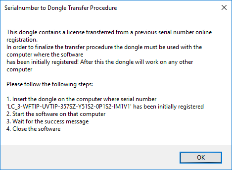 The transfer process is performed with a fresh or used USB-Dongle hardware. In case the USB-Dongle has been previously used, you may over-burn it. All you need is the serial number to be transferred and the target USB-Dongle.