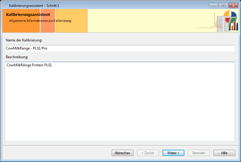 Im ersten Schritt werden allgemeinen Informationen zur Kalibrierung eingegeben. Der Name sollte eine kurzen Hinweis auf die Art der Kalibrierung und den verwendeten Algorithmus geben. Ausführliche Informationen können in das Feld Beschreibung eingegeben werden. Diese Informationen erleichtern Ihnen später das einfache Differenzieren verschiedener Kalibrierungen in der Liste des Kalibrierungs Explorers.