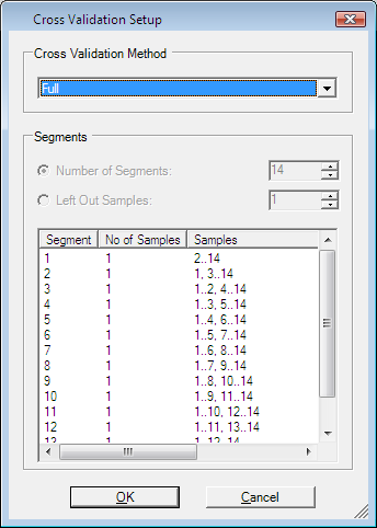 Bei der segmentierten Kreuzvalidierung werden die Proben in verschiedene Gruppen aufgeteilt. Während der Berechnung des Kalibrierungsmodells wird dann jeweils eine Gruppe / Segment ausgelassen. Die Anzahl der Berechnungen entspricht der Anzahl der Segmente. Diese Prozedur erlaubt eine Vorhersage für alle Proben und eine endgültige Kalibrierung, einschließlich aller Proben, wird abschließend berechnet.