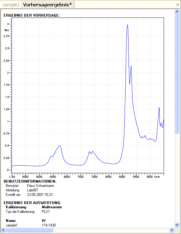Nach der Durchführung einer Vorhersage oder Vorhersage mit einer Kalibrierung oder Methode für ein oder mehrere Spektren anhand einer qualitativen oder quantitativen Kalibrierung, wird ein ausführlicher Bericht mit allen Ergebnissen angezeigt. Der Bericht sieht folgendermassen aus: