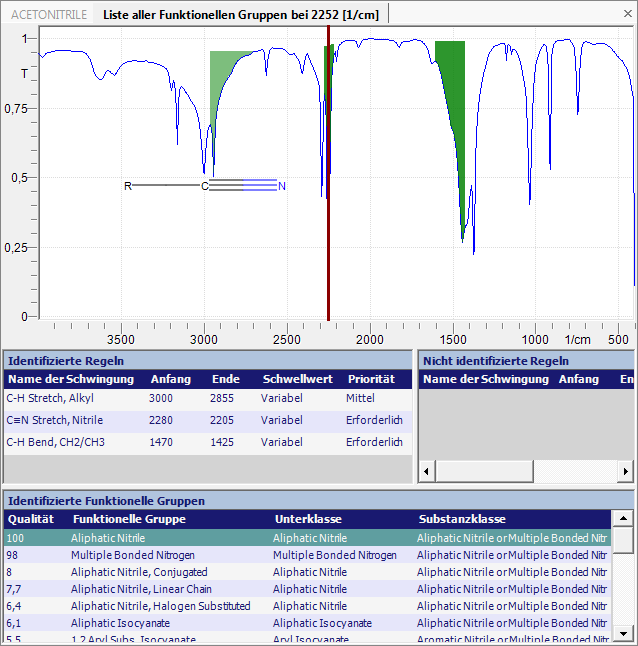 Eine schwarze vertikale Linie kennzeichnet die gewählte Untersuchungsfrequenz im Spektrum. Die Linie kann mittels Drag&Drop auf die gewünschte Frequenz verschoben werden. Die Liste der passenden funktionellen Gruppen wird automatisch aktualisiert und nach der Qualität der Übereinstimmung sortiert. Die funktionelle Gruppe mit der größten Übereinstimmung befindet sich an erster Stelle.