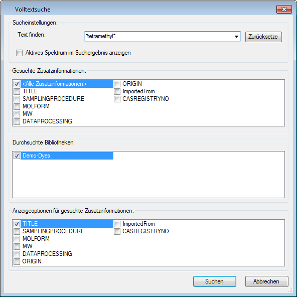 Zur effizienten Arbeit wird häufig Zugriff auf die spektroskopischen Zusatzdaten benötigt. Um alle in der Datenbank vorhandenen Informationen über eine bestimmte Verbindung zu erhalten, kann beispielsweise nach dem Verbindungsnamen gesucht werden. Für diese Zwecke wird die Volltext-Suchfunktion verwendet.