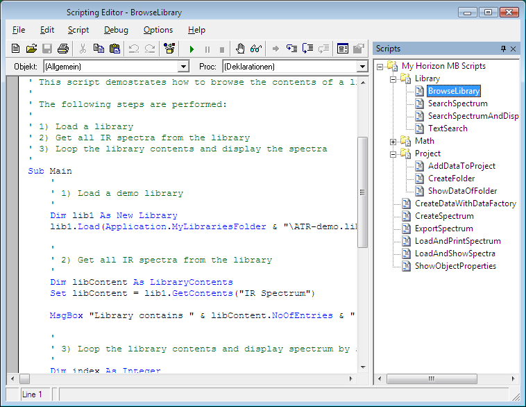 Der Befehl Makro Editor startet den Makroeditor zur Verwaltung und Bearbeitung von Makroskripten. Makros werden zur Automation häufiger Aufgaben verwendet und können die Anwendung vollständig steuern. Einzelheiten finden Sie im Kapitel Makros. Das folgende Bild zeigt den Makroeditor: