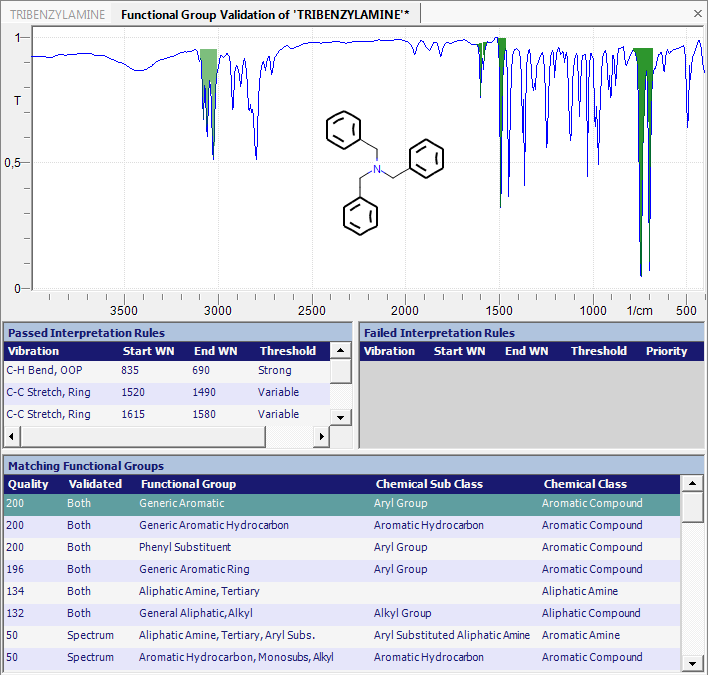 Das analysierte Spektrum und die Molekülformel werden gemeinsam in der Spektrenansicht angezeigt. In den Tabellen werden passende funktionelle Gruppen, sowie die zutreffenden bzw. nicht zutreffenden Regeln für die aktive funktionelle Gruppe dargestellt. Ein detaillierte Beschreibung aller Funktionen der Ansicht finden Sie im Kapitel "Funktionen der Spektrenansicht".