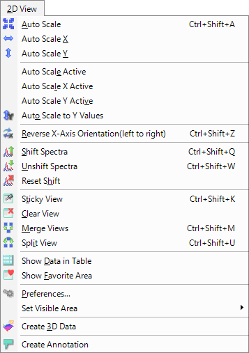 The 2D view menu holds various commands to adjust the visible view port of a 2D data view. Commands are specifically designed to zoom, scale, shift and scroll analytical 2D data to fit the user requirements for printing or further evaluation. If multiple 2D data objects are merged in one view, single objects can be shifted against each other.