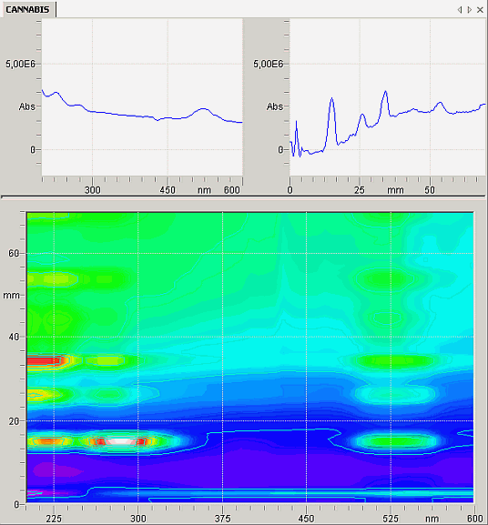 The following figure shows a typical top view of a pseudo 3D data object with a set of two 2D data objects extracted from the x, z plane and the y, z plane. This is a measurement of cannabis extract on a thin layer plate: