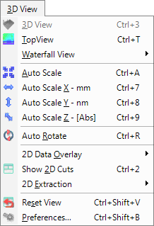 The 3D view menu holds various commands to adjust the visible view port of a 3D data view. Commands are specifically designed to zoom, scale, shift, rotate and scroll analytical 3D data to fit the user requirements for printing or further evaluation.