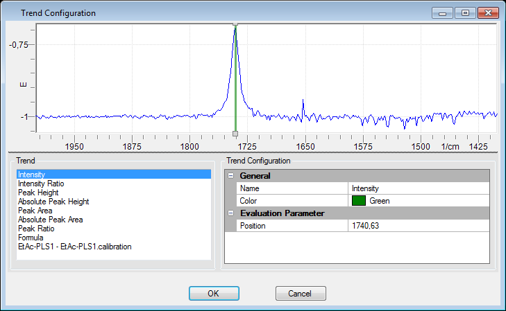 If a sample spectrum is available from a loaded or finished reaction it will be displayed in this view to facilitate the trend configuration. -