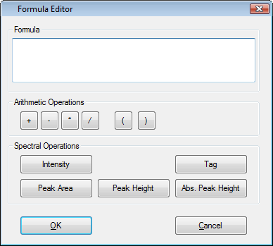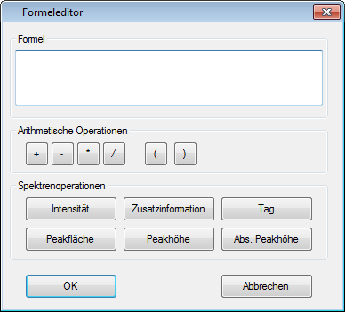 The calibration formula editor allows you to enter an individual formula for calculating a result value for a physical property from spectral data. All intensity values, peak heights or peak areas might be addressed in a custom formula for calculation. Furthermore it is possible to use data stored in custom labels attached to data objects in use.