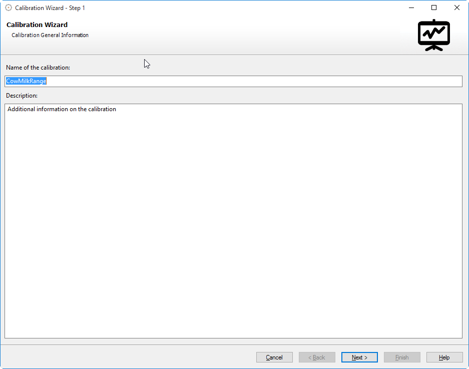 Step 1 offers the general information setup of the new calibration. The new calibration needs to be named and a description should be entered. Ideally the name should briefly describe the type of calibration and the calibration model or algorithm used. The calibration will be referred to by this name throughout the software. Additionally more detailed information can be entered into the description field. This will help you later on to identify the calibration from a list of calibrations in the Quantify explorer.
