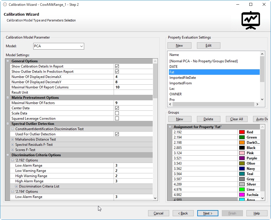 In case of a PCA calibration there are two different options to choose for the property evaluation settings and an additional Groups parameter will be available (see below):