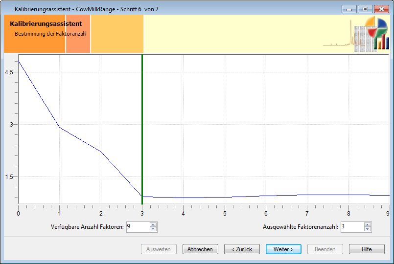 Within the wizard the software proposes a number of analyzed factors. This number can be accepted or may be changed interactively later by moving the vertical line or increasing / decreasing the values using the spin boxes.