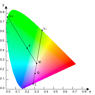 All colors do not have a dominant wavelength. These colors are called non-spectral. For example the color Q (see figure above) does not have a dominant wavelength since the line from W to Q when extended meets the purple line in L. In such cases, the line is extended in the opposite direction and when it meets the visual spectrum at lc, that wavelength is called the complementary wavelength for the color. In this case, the wavelength of lc is the complementary wavelength of Q. Thus mixing lc with Q will help us to get the achromatic color W.