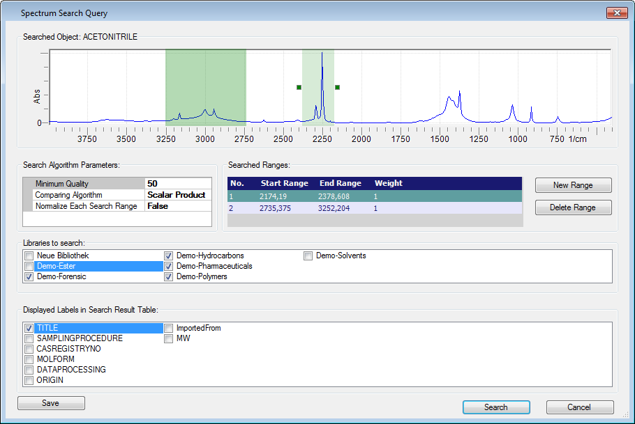 If you need to limit the similarity search to particular spectral regions, you may define search ranges by clicking the New Range button. Searching is applied only to those regions then. (Search regions are emphasized by a green background in the figure above). Obsolete regions can be deleted using the Delete button.