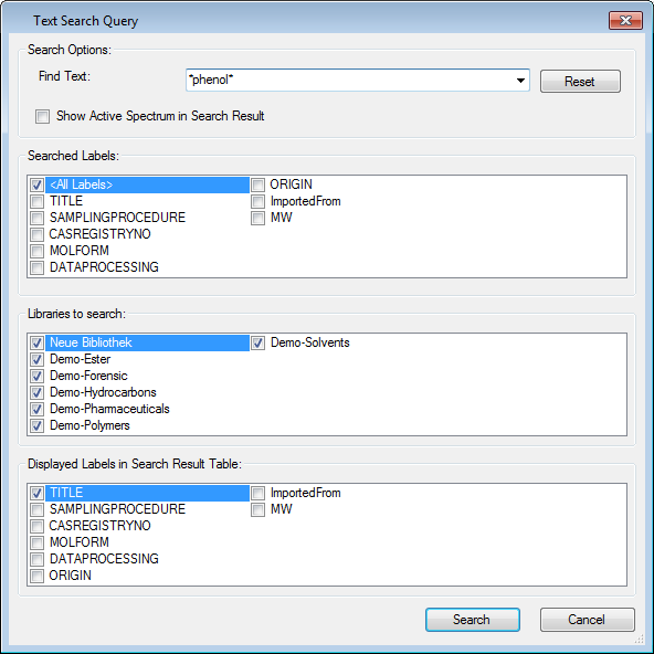 If you want to use a residual spectrum search with the result of a text search, simply activate the option Show Active Spectrum in Search Result. This will display the currently active spectrum together with the results of the text search. You may then use the residual search described above.