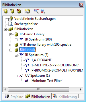 The library tree holds libraries and analytical data enclosed into libraries, predefined search queries and search results. -