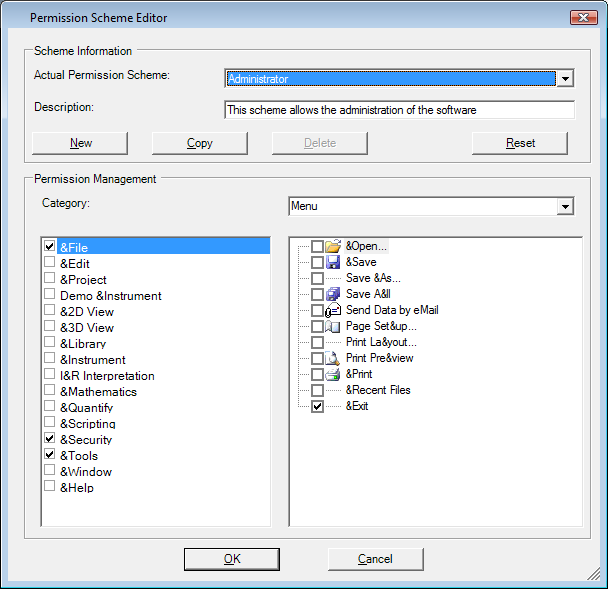 Category:Access permissions are split into categories. The category Menu contains all regular software functions. The category Instrument contains all functions concerning instrument control.