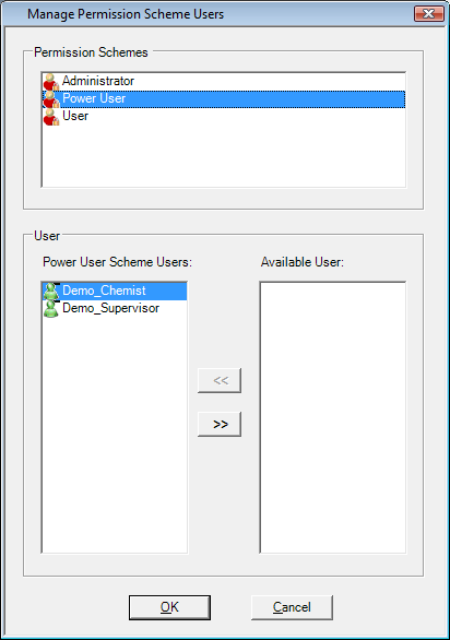 With the security functions of the software activated, all users of the application need to be assigned to a permission scheme. This will automatically be enforced in the User Management Dialog. Creating a new user without assigning a permission scheme is not possible. The permission scheme assignment may be edited later on using the assignment dialog which looks like this: