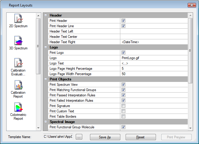 If a corresponding data object is opened in the data view when invoking the print layout dialog, the Print Preview button will be activated for the specific report type. Therefore the user can directly preview the changes in the Print Preview Dialog. For example: If the print layout dialog is invoked while a 2D spectrum is opened in the data view, the Print Preview button for the 2D spectrum layout template will be enabled. By clicking the button the user can preview the 2D spectrum print layout in the preview dialog window.
