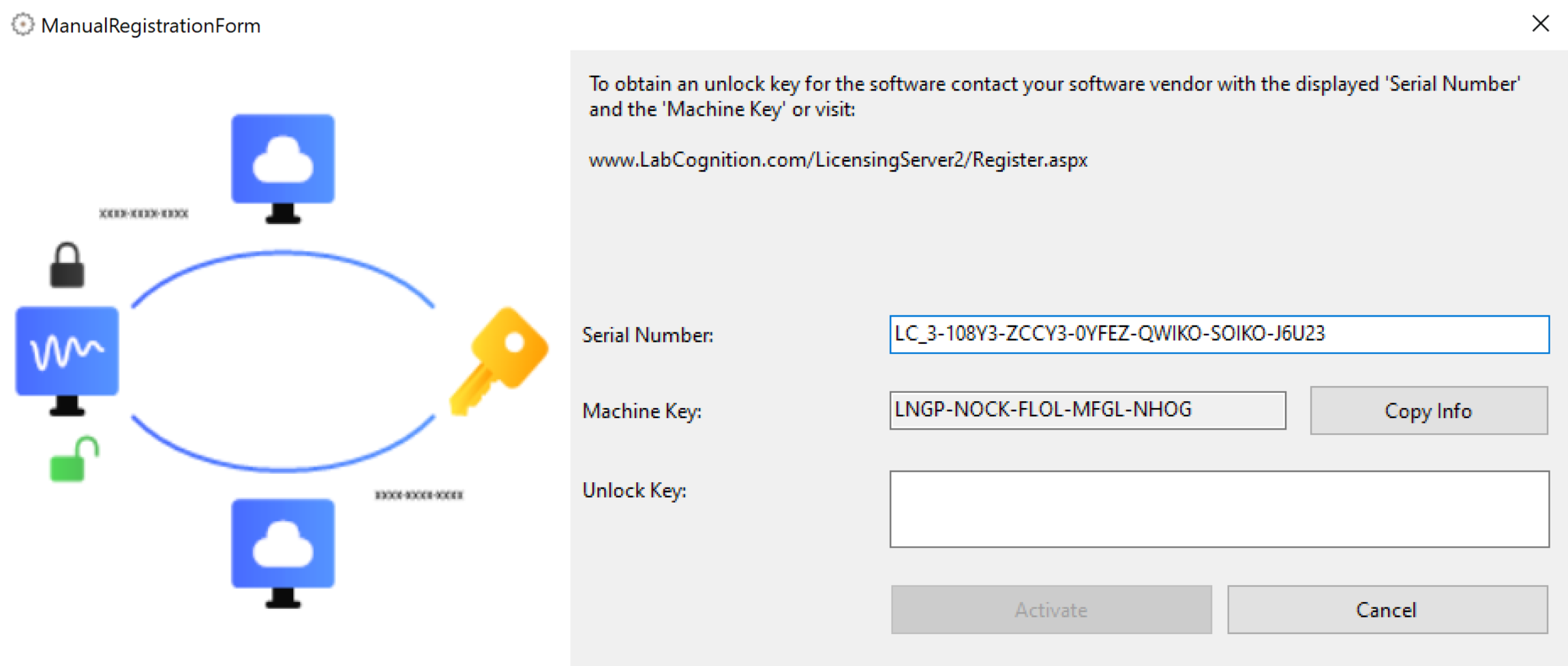 If no internet access is available either contact your software vendor or write an E-Mail to: support@LabCognition.com. Provide them with the file/information (Serial Number and Machine Key) generated in step 5. After that you will receive an Unlock Code as soon as possible via E-mail.