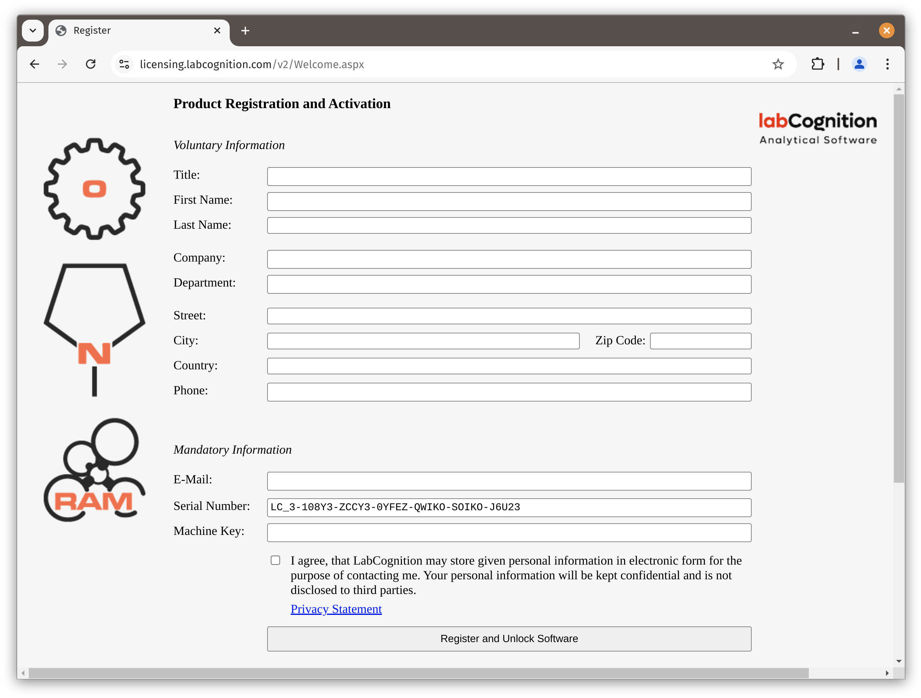 A registration form is shown, which need to be filled with appropriate information. Please copy and paste the serial number and the Machine Key from the file into the registration form
