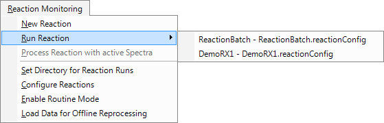 This menu contains all commands for setting up and running the reaction monitoring module. New reaction can be created, already configured reactions can be started and existing data can be loaded for offline processing. The menu also contains the commands for configuring and running the Routine Mode.