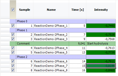 If the option Show Phase Information is checked in parameter panel / reaction wizard (step 5), an extra row with a different color will be inserted for every new phase that is entered during the reaction run. This helps to visually represent the segmentation of the reaction data into phases. -