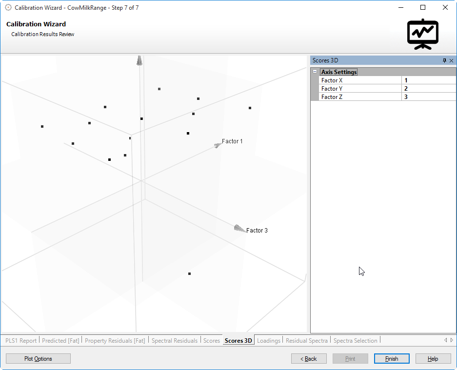 In case of a PCA calibration the score plot gives a convenient overview of the qualitative results of the calibration. A good result will show all samples assigned to one of the predefined groups ( see Calibration Model Wizard - Step 2 ) and the groups itself will be clearly separated.