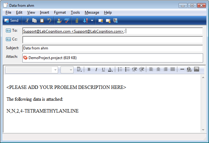 The body of the e-mail will contain the following predefined text "<PLEASE ADD YOUR PROBLEM DESCRIPTION HERE>". Please enter a accurate description of the problem you encountered and the steps you took which led to the described problem.