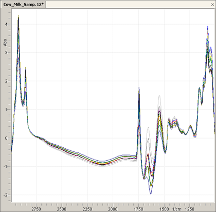This operation is usually applied to multiple data objects. In the following example some NIR spectra of cow milk are shown in one data view: