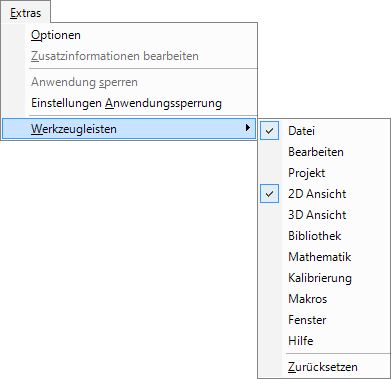 The toolbars contain the shortcut icons which provide a fast way to execute common software functions. The toolbars can be configured and reset using the Toolbars submenu in the Tools menu: