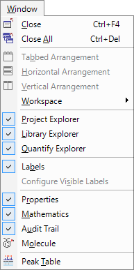 The window menu contains several commands to control the contents of your application workspace. Tab or window arrangement can be customized and stored as custom workspace here. Missing tabs can be re-opened again.