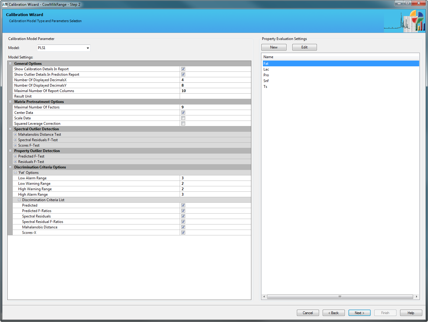 In case of a PCA calibration there are two different options to choose for the property evaluation settings and an additional Groups parameter will be available (see below):