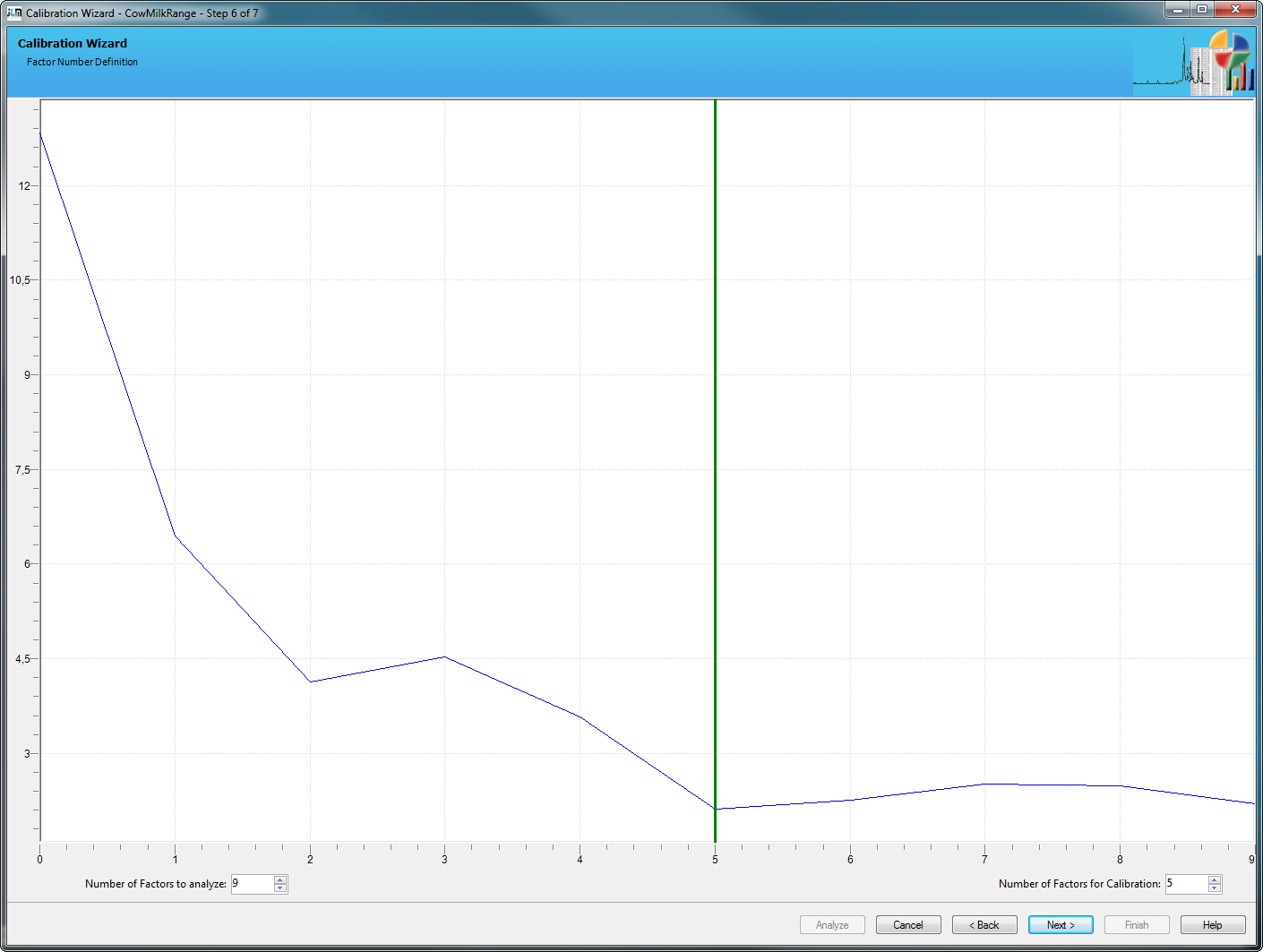 Within the wizard the software proposes a number of analyzed factors. This number can be accepted or may be changed interactively later by moving the vertical line or increasing / decreasing the values using the spin boxes.