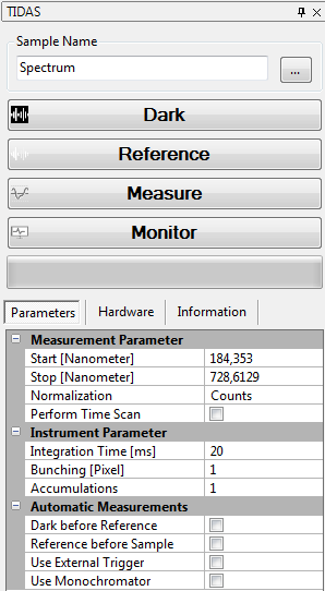 Starts a continuous data acquisition and displays measured spectra immediately in an online monitoring data view. Since the data is displayed in real time, this is useful for integration time or accumulations adjustment. The live view mode can be stopped by clicking on the **Monitor-**button again. Measurement details of the current live spectrum acquisition are displayed in the status-bar of the main application window.