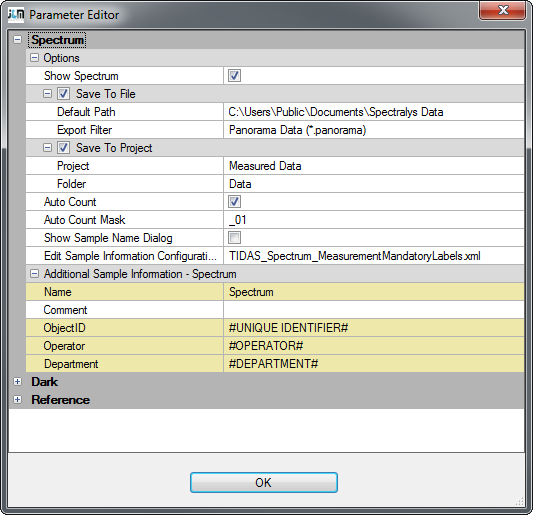 The Spectralys software supports three different spectral data object types: Dark, Reference and Spectrum. For each type this dialog shows different areas to control the sample information / auto save options: