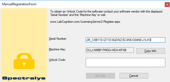 If no internet access is available either contact your software vendor or write an E-Mail to: support@LabCognition.com. Provide them with the file/information (Serial Number and Machine Key) generated in step 5. After that you will receive an Unlock Code as soon as possible via E-mail.