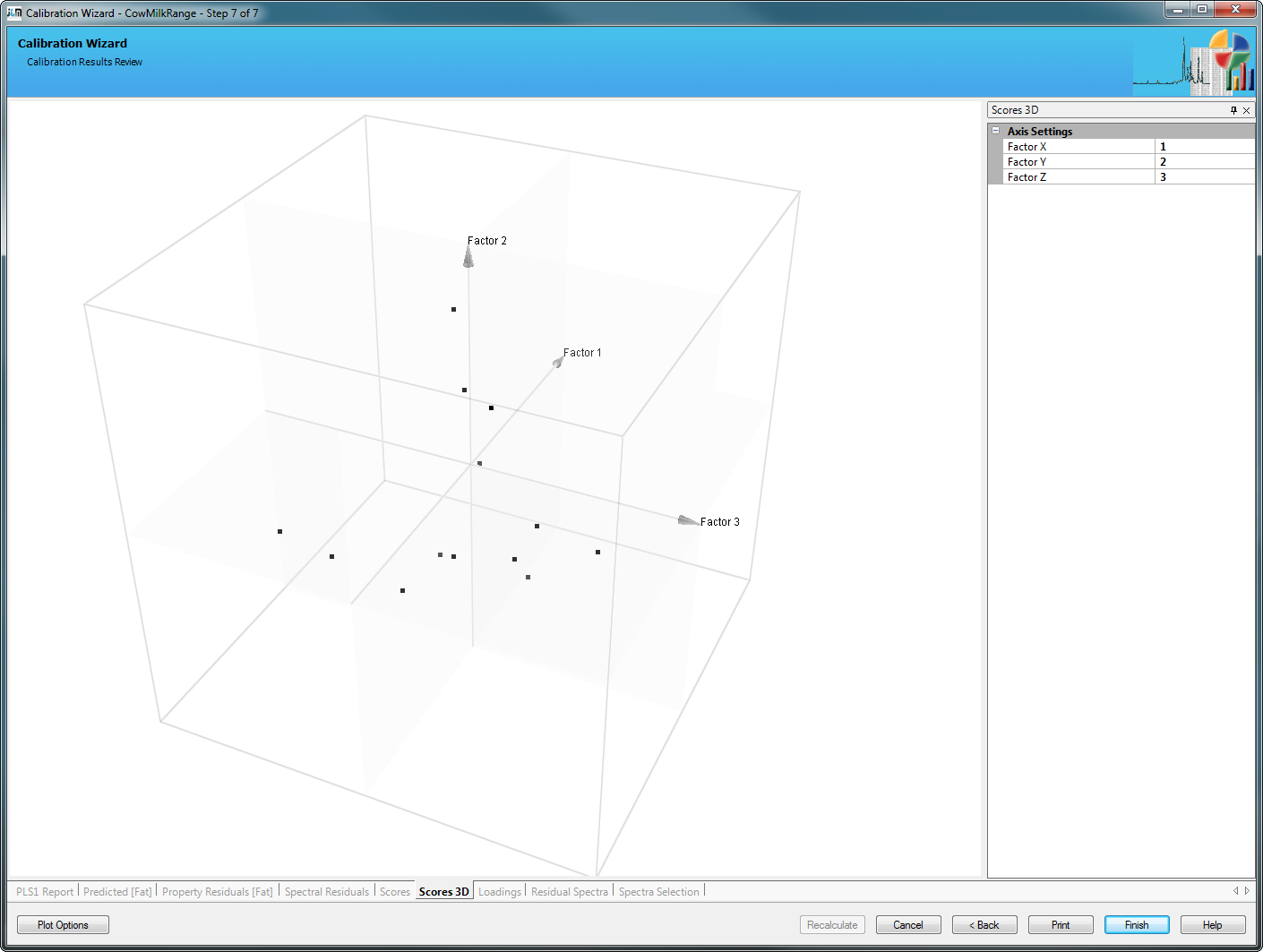 In case of a PCA calibration the score plot gives a convenient overview of the qualitative results of the calibration. A good result will show all samples assigned to one of the predefined groups ( see Calibration Model Wizard - Step 2 ) and the groups itself will be clearly separated.
